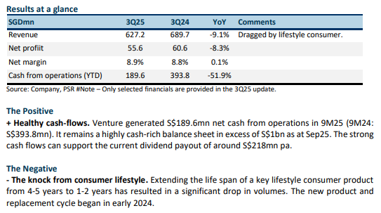 - 3Q25 results were within expectations. Both 9M25 revenue and PAT were 76% of our FY25e forecast. Net profit in 3Q25 fell 8.3% YoY to S$55mn. The shorter replacement cycle of the key lifestyle consumer product was a significant drag on revenue.