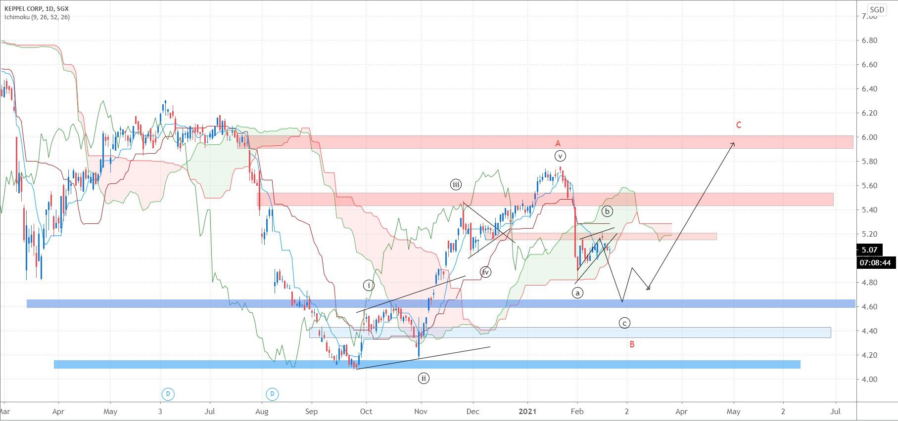 Keppel Corp has broken out of the sub-corrective rising wedge and we expect prices to continue to slide further into $4.60 support region. Overall, the corrective ABC wave structure has yet to complete and should $4.60 holds, prices are expected to rally to $6.14.