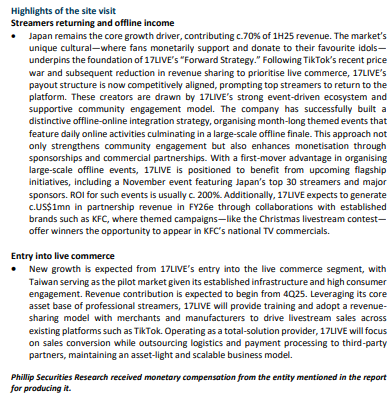 • PATMI catalysts are expected to stem from offline events within its core streaming business, as 17LIVE partners with top streamers across various platforms. Additional upside is from new revenue streams, including its total-solution live-commerce platform and upcoming short drama segment. We maintain our FY25e financial forecasts and reiterate our BUY recommendation with a higher TP of S$1.45 (prev: S$1.28) after lower WACC by 2.4ppts to 10.9%, reflecting continued growth in the core streaming business and incremental contributions from new segments. 17LIVE remains committed to enhancing shareholder returns, declared an interim dividend of 1.5 Singapore cents for 1H25. The group holds US$82.2mn in cash, accounting for c.60% of its market capitalization, and trades at a FY25e P/E of 20x with a dividend yield of c.3%.