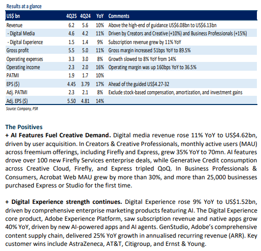 • For 1Q26e, Adobe expects adj. EPS of US$5.85–5.90 (+16% YoY) on revenue of US$6.25–6.30bn (+10% YoY), driven by 10% growth in Creative & Marketing Professionals Subscription revenue to US$4.3–4.33bn. The US$1.9bn Semrush acquisition is expected to close in 1HFY26e, with minimal impact on EPS in the first year and accretive thereafter.