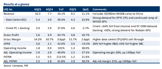 • 4Q25 revenue was within our expectations, with FY25 revenue at 100% of our FY25 forecast. 4Q25 PATMI exceeded our expectations, with FY25 revenue at 112% of our FY25 forecasts. This was due to higher Instinct MI350 series GPU and EPYC CPU sell-through. The higher mix of data centre revenue drove margin expansion, as data centre revenue accelerated 39% YoY to US$5.4bn, accounting for 52% of 4Q25 revenue (3Q25: 47%).