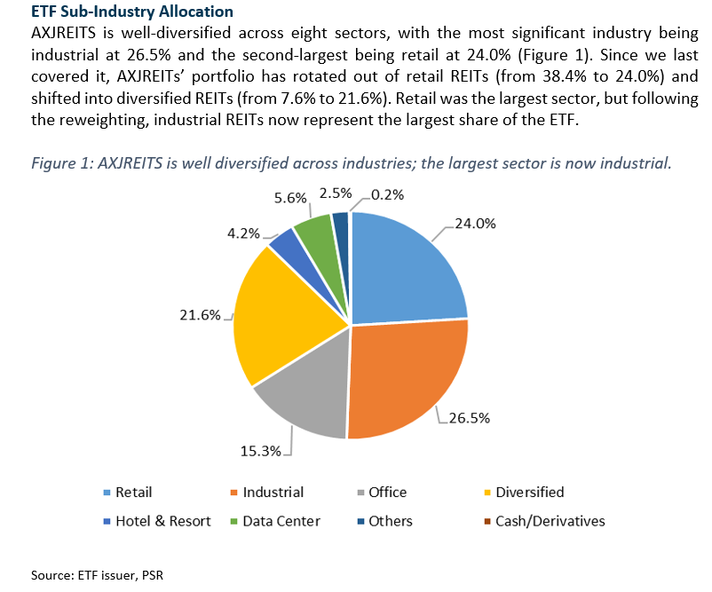 ·         The ETF has changed its name from “NikkoAM-StraitsTrading Asia ex Japan REIT ETF” to “Amova-StraitsTrading Asia ex Japan REIT ETF”. There were 3 new additions (IGB Real Estate Investment Trust, RL Commercial REIT & Sunway Real Estate Investment) and 2 removals (Nexus Select Trust & Paragon REIT) during the period. AXJREITS remains well-diversified across eight different sectors; its largest sector has changed from retail to industrial (26.5%).