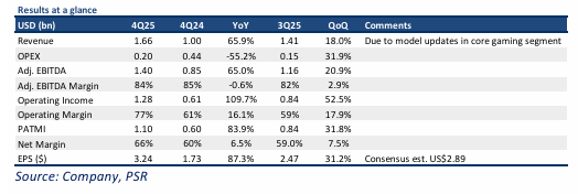 Strong profitability growth. APP’s 4Q25 net income surged 84% YoY to US$1.1bn, driven by