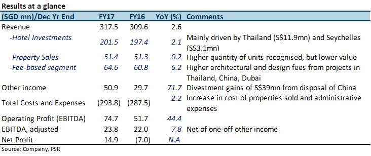+ Improved property sales with sales value jumping 44% YoY: The Group sold 195 units worth S$137.8mn in FY17, contributed largely by Cassia Phuket, Phase 3 (c.46%) where sales were driven by demand from Chinese and Russian investors.