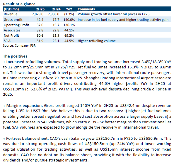 • 2H25/FY25 PATMI exceeded our expectations at 55%/77% of FY25e forecast. Jet fuel volumes increased 15.3% YoY to 8.8mn mt in 2H25 while margins expanded sharply, with gross profit surging 140% YoY to US$42.4mn. CAO is in a strong net cash position of US$686.9mn.