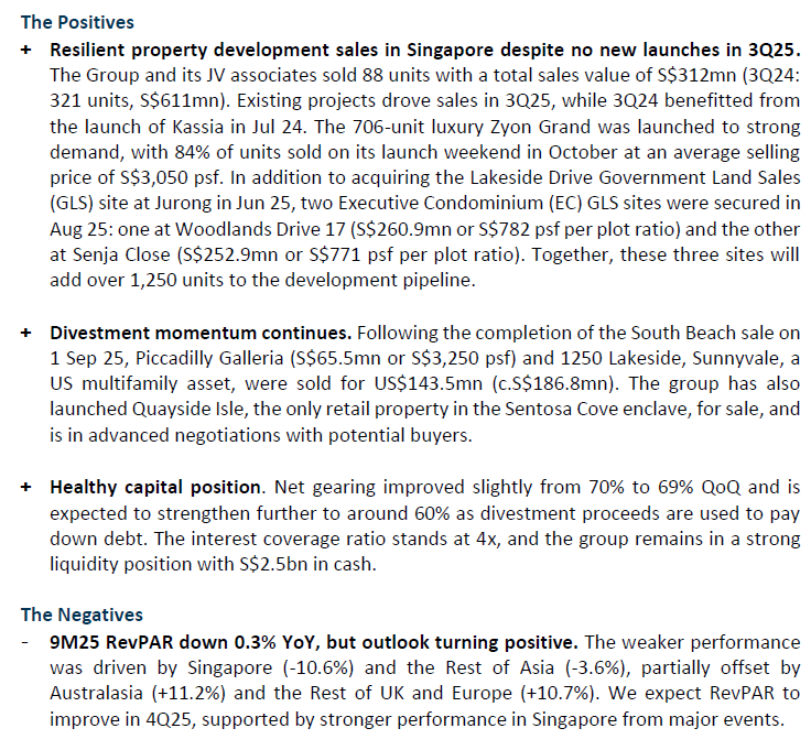 • Under property development, sales were supported by existing projects as there were no new launches in Singapore in 3Q25. For 9M25, the hotel segment recorded a slight 0.3% YoY decline in RevPAR, mainly due to softer performance in Asia, particularly in Singapore (RevPAR down 10.6%), reflecting the high base in 2024 and the shift of the F1 Singapore Grand Prix from 3Q24 to 4Q25.