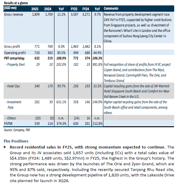 -FY25 PATMI of S$630mn (+213% YoY) exceeded our expectations, coming in at 88% above our FY25e estimate. Growth was driven by strong Singapore residential sales and substantial capital recycling gains, with c.S$2bn in divestments in FY25, including the sale of its 50.1% stake in South Beach.