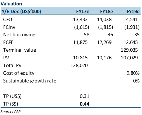 Based on unchanged 9.8% cost of equity and discounted FCFE, we derive our updated TP of S$0.44 (previous: S$0.68). We maintain our “Buy” rating, which implies a 49.2% return from the last close price of S$0.295.