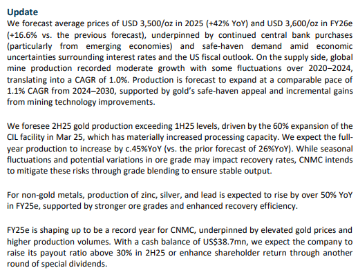 • We raise our FY25e PATMI forecast by 40% to US$40.3mn, supported by surging gold prices (+42% YoY) and steady improvement in gold production (+45% YoY). The share price upside is expected to stem from either a higher dividend payout ratio or another special dividend in 2H25, given that the market essentially expects the exceptional profit outlook. We maintain our BUY rating with a higher DCF target price of S$1.34 (prev: S$0.70), implying a 12.2x FY25e P/E. Our valuation remains conservative, as no terminal value has been factored in, given that the mining permit is valid until 2034. We assume a dividend payout ratio of 30%, consistent with CNMC’s strong track record of enhancing shareholder value during years of robust financial performance, translating into a yield of 3%. Despite the share price rally of c.360% YTD, CNMC is trading at FY25e P/E of 10.5x, still well below the industry average of 24x (Zijin Gold International FY25e P/E: 32x).