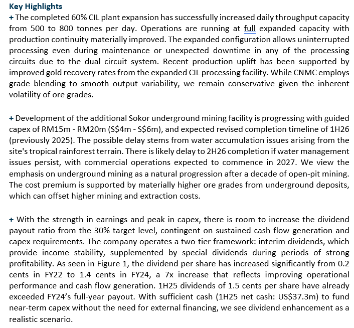 • We raise our gold price forecast by 13% to US$4,300 (Prev: US$3,800) due to the current gold price surging 21% above the previous forecast. PATMI has been raised by 6.6% in FY26e.  Key catalysts include i) earlier than anticipated completion of the additional Sokor Underground mining facility, ii) a higher dividend payout ratio. (Current payout ratio: 30%). We maintain our BUY rating with a higher target price of S$1.47 (Prev: S$1.34), implying a 11.2x FY25e P/E. Our valuation remains conservative, as no terminal value has been factored in, given that the mining permit is valid until 2034.