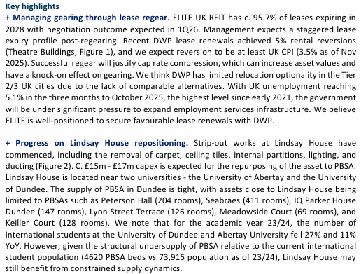 • Partial lease regearing outcome for c. 95.7% of leases expiring in 2028 is expected in 1Q26. Lindsay House’s first phase of repositioning to PBSA is underway, with stabilisation expected before September 2027 in line with the beginning of the academic year. Potential acquisition plans are under review, with sponsor assets being the most visible option.