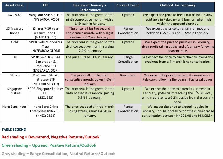 • Heading into February, we expect gains for the ETFs tracking the S&P 500, Oil, Singapore Equities, and the Hang Seng Index. On the other hand, ETFs tracking Gold and Bitcoin are likely to pull back. Meanwhile, the ETF tracking US Treasury Bonds is likely to remain rangebound.