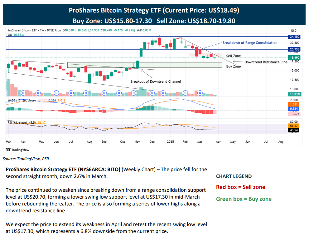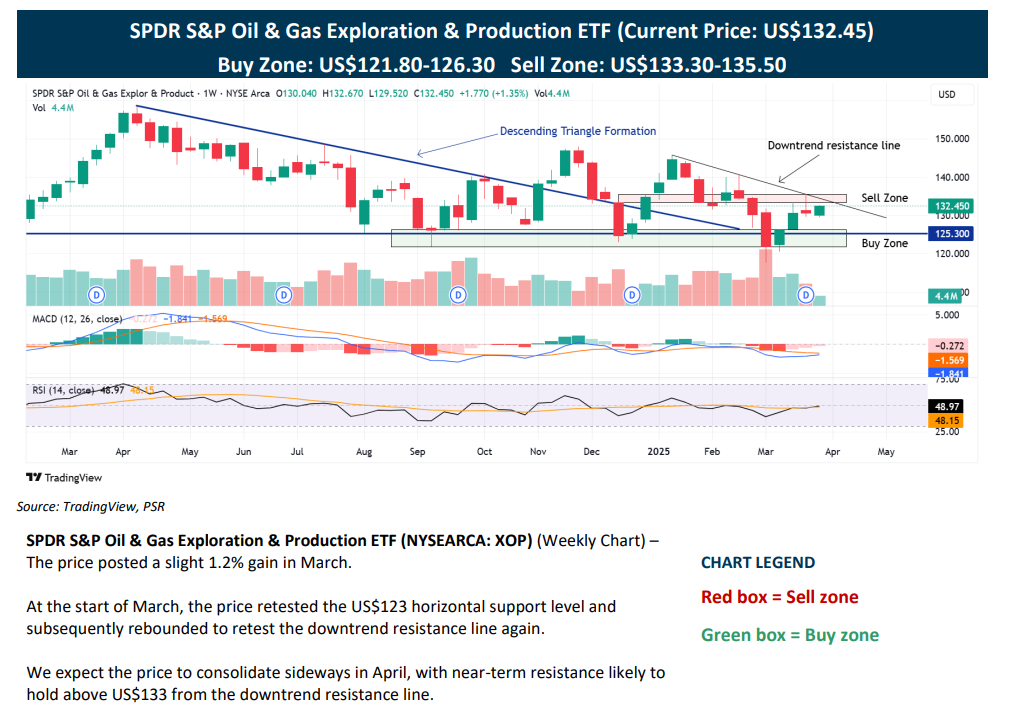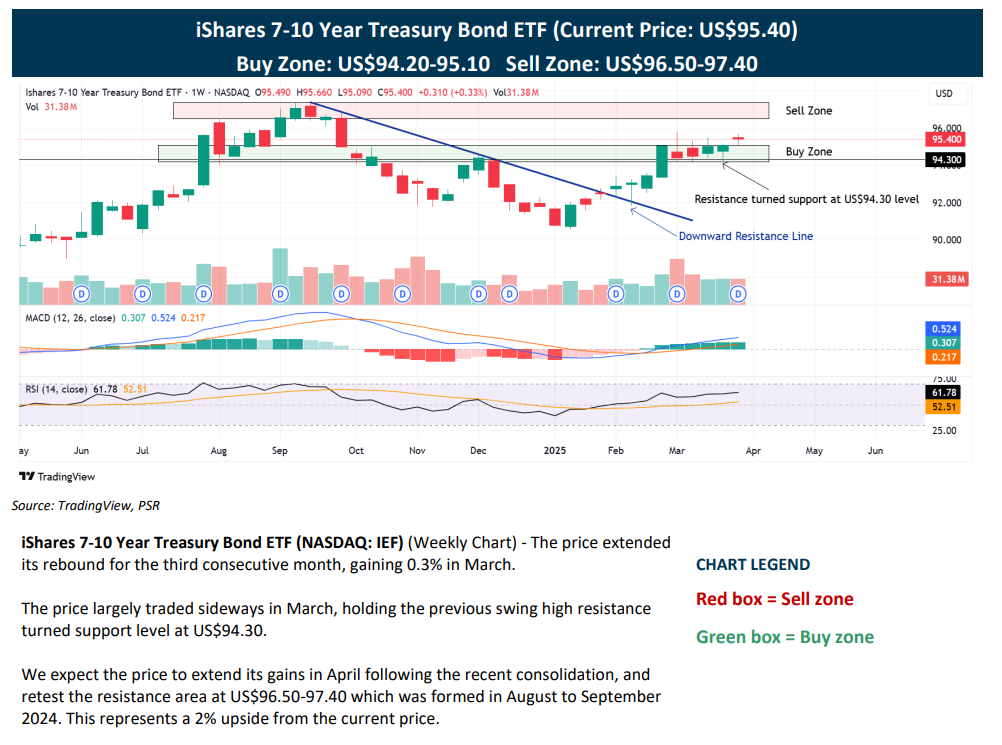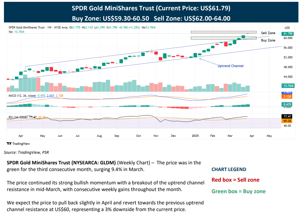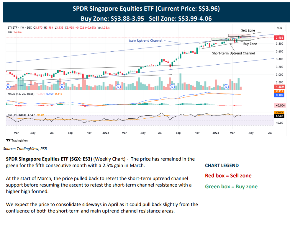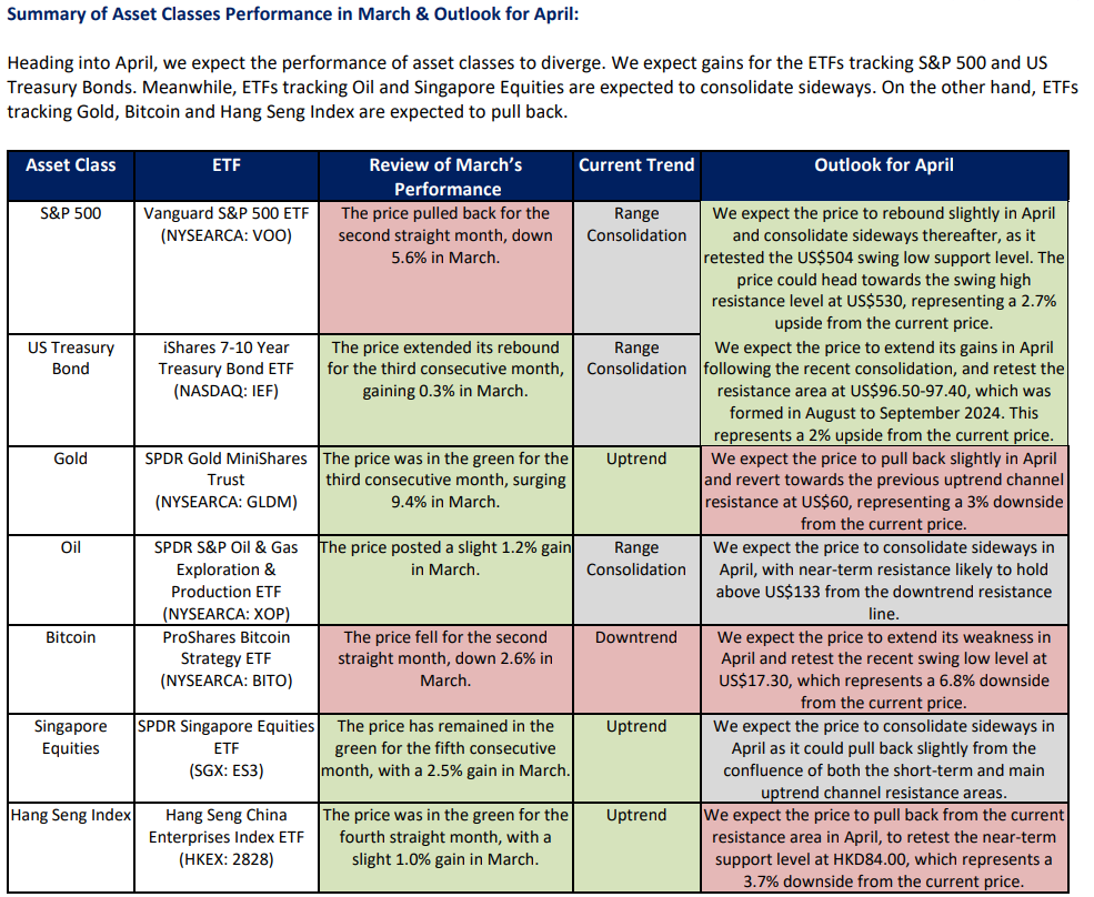 • Heading into April, we expect the performance of asset classes to diverge. We expect gains for the ETFs tracking S&P 500 and US Treasury Bonds. Meanwhile, ETFs tracking Oil and Singapore Equities are expected to consolidate sideways. On the other hand, ETFs tracking Gold, Bitcoin and Hang Seng Index are expected to pull back.