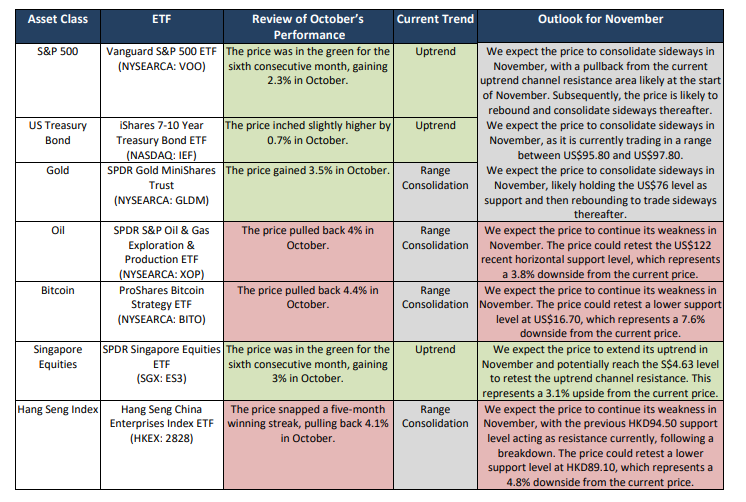• Heading into November, we expect ETFs tracking the S&P 500, US Treasury Bonds, and Gold to consolidate sideways. On the other hand, ETFs tracking Oil, Bitcoin, and the Hang Seng Index are likely to extend their weakness into November. Singapore equities could remain a bright spot, with the uptrend expected to continue.