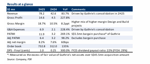 ▪ 2H25 adjusted PATMI spiked 98% YoY to S$6.4mn, driven by Guthrie’s consolidation.