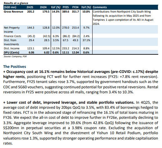 • Excluding Hougang Mall due to its ongoing AEI, 4Q25 shopper traffic and tenants’ sales saw healthy YoY growth at +1.5% and +3.9%, respectively (FY25: +1.6% and +3.7%). The average cost of debt fell 20bps QoQ to 3.5%, down from the 4% peak in 1Q25.