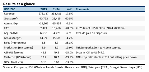 + Production jumps. 2H25 coal production increased 20% YoY to 5.9mn MT. The increase