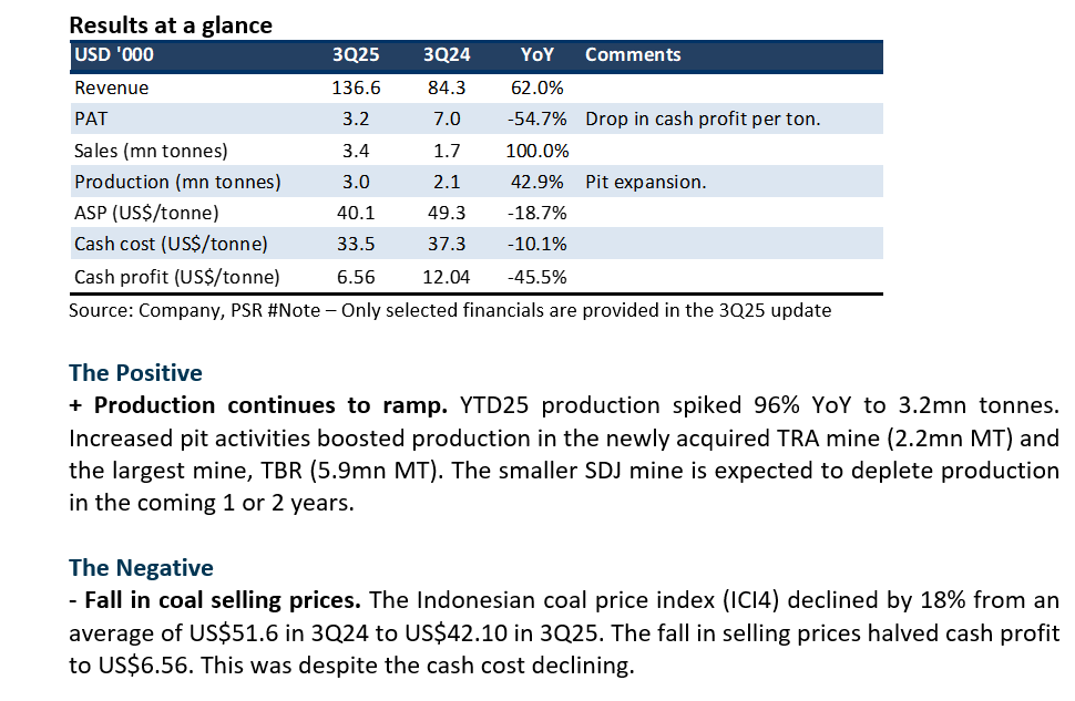 • 3Q25 earnings were below expectations. 9M25 revenue and PATMI were 86%/56% of our FY25e forecast. Net profit declined 55% YoY to US$3.2mn despite a 100% jump in coal sales to 3.4mn tonnes. Earnings declined due to a 19% YoY fall in selling prices. It dragged cash profit per tonne lower by 45% to US$6.5 per tonne. A 0.1-cent interim dividend was declared.