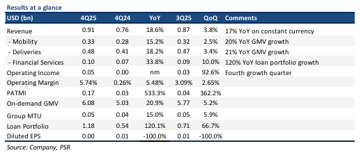 + Mobility driving margin expansion. Grab’s mobility continued to post strong results, with