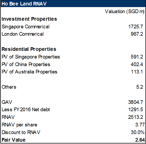 At 0.55 P/NAV, HBL trades at a bigger discount to the peer average (market capitalisation >SGD 1bn) of 0.69. We opine that interest in high-end properties is returning as the divergence in prices between Singapore’s and regional high-end property widens. The returning interest should narrow the P/NAV gap in HBL’s share price. As such, we narrow our discount to RNAV from 40% to 30%. We maintain our ACCUMULATE call on Ho Bee Land with an increased RNAV-derived target price of S$2.64 (from S$2.20).