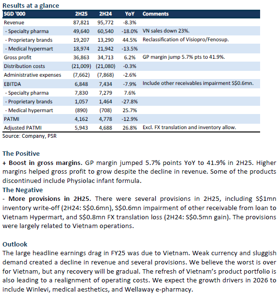 • 2H25 revenue declined 8% YoY to S$97.8mn, led by 23% drop in revenue from Vietnam. There were several challenges in Vietnam: elevated Sterimar inventory, deprioritisation of contrast media, a weak currency, and discontinuation of several products. The ability to pass on higher-priced Euro speciality products has been a challenge. Vietnam is refreshed, with greater emphasis on better-margin products.