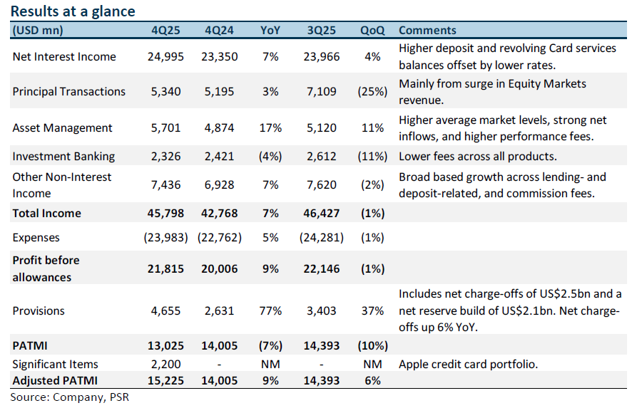 • Adj. 4Q25 PATMI rose 9% YoY to US$15.2bn, meeting our estimates, with FY25 earnings at 101% of our FY25e forecast. Asset management income and NII supported earnings growth while IB fees disappointed. Despite NIM declining by 7bps, NII grew from higher deposit balances and higher revolving balances in Card Services. DPS rose 20% YoY to US$1.50. The dividend payout ratio increased to 32% (4Q24: 26%), with net common stock repurchases in 4Q25 at US$7.9bn (4Q24: US$4bn).