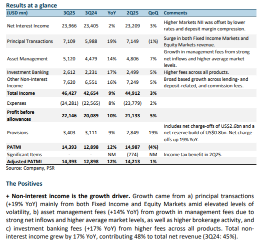 • 3Q25 earnings rose 12% YoY to US$14.4bn, below our estimates, with 9M25 earnings at 67% of our FY25e forecast. Trading, asset management, and IB income supported earnings growth. NII inched up slightly from loan growth of 7% YoY as NIM declined by 13bps. DPS rose 20% YoY to US$1.50. The dividend payout ratio increased to 29% (3Q24: 28%), with net common stock repurchases in 3Q25 at US$8 billion (3Q24: US$6bn).