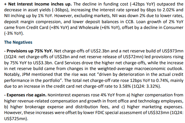 • NII increased 1% YoY from higher Markets NII while loans grew 2% YoY. Noninterest income (+17% YoY) was the main growth driver from continued improvement in principal transactions, investment banking, and asset management fees. JPM is guiding FY25e NII of US$94.5bn (+2%) and expenses of US$95 billion (+3%).