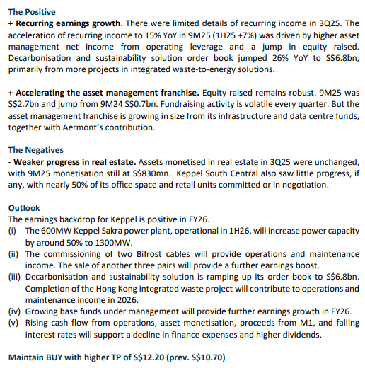 • Limited financials were provided, except that the 9M25 core net profit rose over 25% YoY. The growth rate is in line with 1H25 core net profit that climbed 29% YoY to S$444mn (excluding connectivity). More importantly, 9M25 recurring net profit (asset management and operating income excl. corporate) rose 15% YoY, faster than the 7% in 1H25.