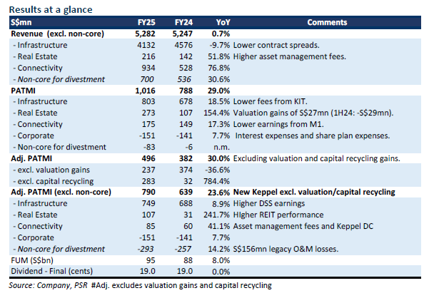 + Growth in core operations. Core PATMI of New Keppel rose 23.6% YoY in FY25 to S$790mn.