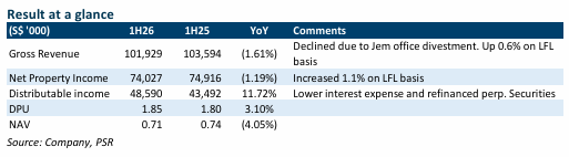 • 1H26 DPU of 1.85 cents rose 3.1% YoY, forming 51% of our full-year FY26e forecast. The resilient performance of the retail portfolio (rental reversion up 10.4% YoY) and strong capital management (gearing down 430 bps to 38.4%) resulted in a 11.7% YoY increase in distributable income to S$48.5mn.