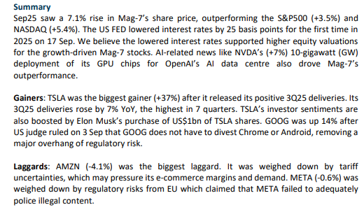 • Mag-7’s performance in Sep25 was supported by the US Federal Reserve (FED) lowering interest rates by 25 basis points, which supported the higher equity valuations for the growth-driven Mag-7 stocks. We expect more rate cuts, as monetary policy becomes more of a fiscal tool to stimulate the economy when more FED members are replaced by the Trump administration. There is greater sovereign demand for AI infrastructure, MSFT committing US$30bn in UK’s AI infrastructure and NVDA agreeing to scale up 300,000 GPUs (worth ~US$75bn) in AI factories across the US, Portugal, Norway, and UK. Demand for iPhone 17 exceeded expectations, but Apple still lags in AI development as Siri revamp is delayed until 2026. We maintain OVERWEIGHT on the Mag-7. Except for TSLA, we believe the Mag-7’s earnings growth will continue to outperform both the S&P 500 and Nasdaq 100. Tailwinds include greater adoption and demand of AI from sovereign nations like the EU and UAE, and the US government’s AI Action Plan unveiled in Jul25.