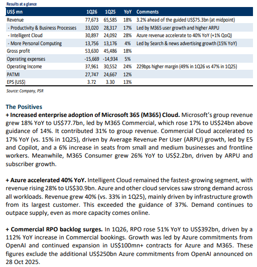 • The Microsoft–OpenAI new agreement reinforces Microsoft’s Cloud and AI leadership, supported by IP rights through 2032 and a US$250bn Azure commitment. RPO backlog surged 51% YoY to US$392bn, fuelled by 112% YoY growth in Commercial bookings.