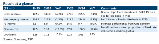 from 4.7%, cutting FY25 finance costs by 17.6% to S$87.8mn. OUE REIT’s lower fixed rate debt