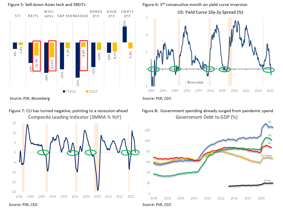 Outlook: Global growth continues to ease. Most macro indicators are at their lowest point since the pandemic began. There are no growth drivers on the horizon. Europe is facing a recession under the weight of skyrocketing energy prices. Energy rationing during winter could further depress the region. The Fed is intent on slowing the US economy with higher interest rates, while China remains gripped in a lockdown. Rising interest rates globally will deflate both valuations and earnings. We believe the US economy faces a high probability of a recession next year. Most leading indicators are flashing red, indicative of a coming recession (Figures 6 and 7). US corporates face the trifecta of an appreciating dollar, higher interest rates and rising material costs. And made worse by “just too much” inventory. In the past three recessions, earnings declined by around 20%. The forecast for 2022 is still mid-teens growth. Singapore’s corporates are in much better shape, backstopped by a resilient domestic economy and rising interest rates bolstering bank margins. After major fiscal spending on the pandemic, governments have smaller balance sheets to reinvigorate their economies (Figure 8). The UK is trying to spend its way out of recession and energy inflation. But the cost is a 20% collapse in its currency (Figure 9) and surging government bond yields (Figure 10). China appears to be the only government with a balance sheet to support its economy and indicators point to an economy bottoming out (Figure 11). Another promising sign is the peaking of inflation. Headline inflation in the US is highly correlated to commodity prices (Figure 12), which have crested. However, it is not time to rejoice. Firstly, the critical core inflation is stubbornly high from rising rents (Figure 13) as the housing supply is still constrained. Secondly, oil prices are weak following massive selling of US strategic petroleum reserves (Figure 14). But that will end in November. Thirdly, for the Fed to pause its hiking cycle, core inflation needs to decline meaningfully and sustainably. A condition several months away (Figure 15). To address both the global plight of weak economic growth and stubborn inflation, capital expenditure needs to be revived. Investments will come from more onshoring of manufacturing capacity to buttress supply chains. They will also stem from a restoration of energy independence for security and climate agendas. Notable sectors that benefit from this in Singapore are semiconductor equipment makers and oil and gas vessel yards or owners.