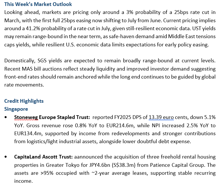 3. Looking ahead, markets are pricing only around a 3% probability of a 25bps rate cut in March, with the first full 25bps easing now shifting to July from June. Domestically, SGS yields are expected to remain broadly range-bound at current levels.