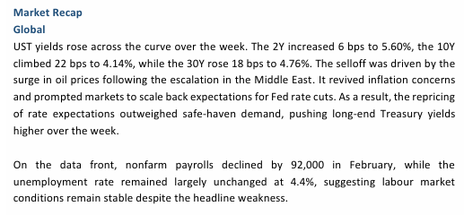 3. Looking ahead, we expect the Fed to keep rates unchanged at the upcoming March FOMC meeting as labour market conditions remain broadly stable. In the near term, UST yields could remain biased higher as the recent surge in oil prices following the Iran–Israel escalation revives inflation concerns and prompts markets to scale back expectations for Fed easing. Domestically, SGS yields are likely to track movements in global rates but with a smaller movement.