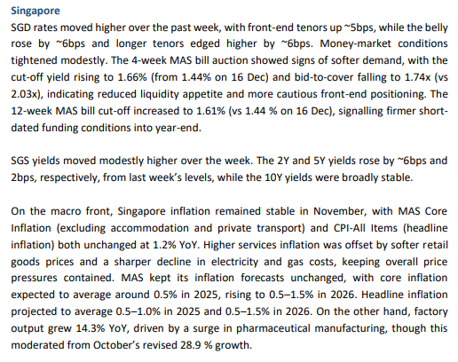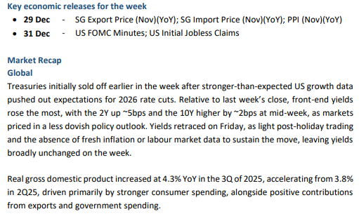 3) Looking ahead, USTs are likely to trade range-bound, as strong growth data limits the urgency for near-term rate cuts. Domestically, with 2026 GDP growth projected at 1–3% and core inflation at 0.5–1.5%, Singapore’s macro backdrop remains supportive of policy stability. MAS is expected to keep the S$NEER parameters unchanged next year, preserving flexibility amid global uncertainty.