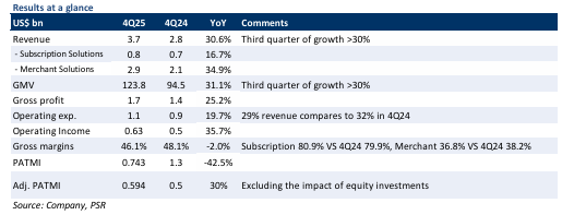 increased to 68% of GMV (64% in 4Q25), with US$84bn processed in 4Q25 (+38% YoY),