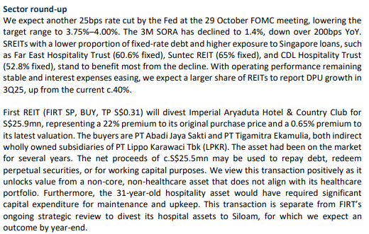 • We reiterate our OVERWEIGHT recommendation on S-REITs, favouring those with strong sponsors, robust balance sheets, and improving operating performance. Within sub-sectors, we prefer retail, particularly suburban malls, which have shown greater resilience in downturns and continue to deliver high single-digit positive rental reversions. We favour overseas S-REITs that offer high yields with resilient fundamentals, such as Stoneweg Europe Stapled Trust (SERT SP, BUY, TP €1.86), Elite UK REIT (ELITE SP, BUY, TP: £0.39), and First REIT (FIRT SP, BUY, TP S$0.31). Potential catalysts include inorganic growth via asset recycling and a faster pace of interest rate cuts.