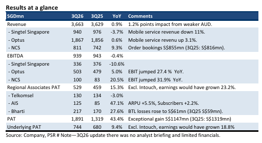 + Jump in Advanced Info (AIS) earnings. Contribution from AIS in 3Q26 jumped 47.8% YoY