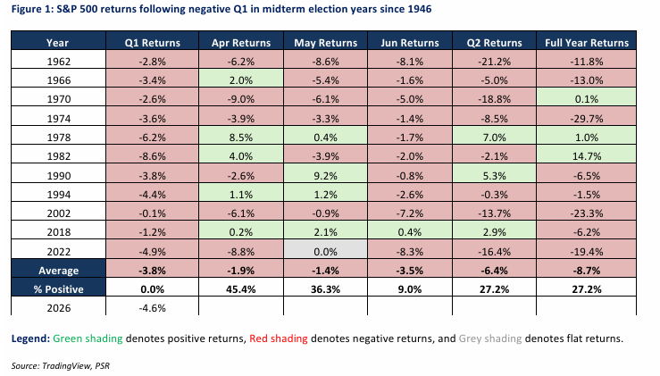 The S&P 500 is down 4.6% in the first quarter of 2026. This report looks at the S&P 500’s performance following a negative first