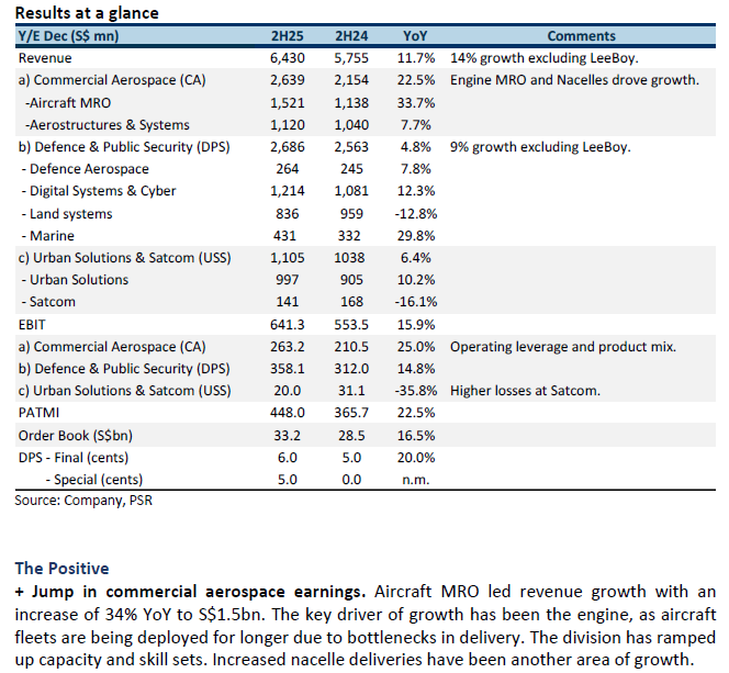2H25 earnings grew 23% YoY to S$448mn, supported by 25% and 15% jump in commercial aerospace (CA) and defence (DPS) operating earnings, respectively. Engine MRO and nacelle production were the key drivers of CA’s growth. Operating leverage and product mix also expanded margins, especially for DPS.