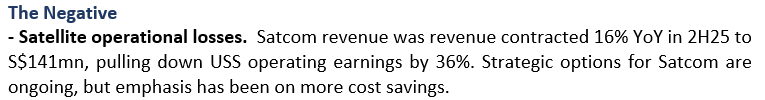FY25 results were within expectations. Revenue/adj. PATMI were 97%/99% of our FY25e forecast. Headline earnings were a decline of 34% YoY to S$462mn due to S$667mn impairment of iDirect. FY25 adj. PATMI was up 21% to S$850mn.