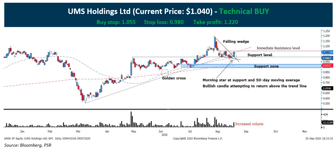 UMS Holdings Ltd (SGX: 558) upside has been strong given the evidence that the stock has cleared above the $1.00 psychological mark since it broke out of the 2 months resistance at $0.985 from May to July. Based on the technical, the stock will continue the upside: