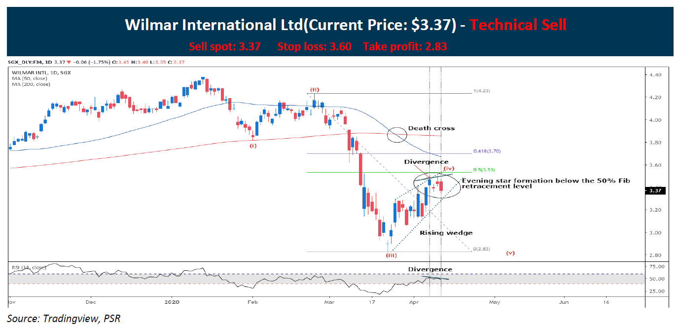 Wilmar international (SGX: F34) strong sell-off since early March 2020 has confirmed the bearish impulse of the 5 wave structure. Based on the technicals, we believe that the stock bullish move is coming to an end: