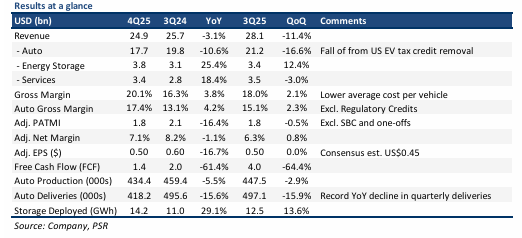 BYD, dominates the Chinese EV market (4Q25: deliveries +9% YoY and 19% market share). – Lower demand from higher ASPs. We estimate TSLA’s ASPs rose by 6% this quarter, the first