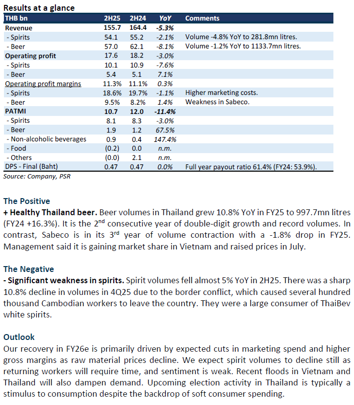 • Results were below expectations. FY25 revenue/PATMI were 92%/86% of our forecasts. 2H25 spirits PATMI dropped 3% YoY. Volumes contracted sharply by almost 11% YoY in 4Q25. The border dispute with Cambodia resulted in the huge migrant worker population leaving Thailand and caution in the supply chains.