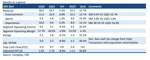 • Both 1Q26 revenue and adj. PATMI were in line with expectations. 1Q26 revenue/PATMI was at 25%/26% of our FY26e estimates.