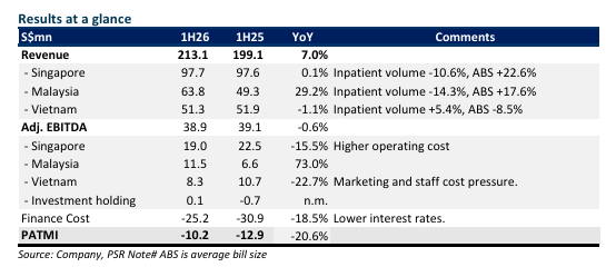 • Results were below expectations. 1H26 revenue met expectations at 49% of our forecast. However, margins were worse than expected with EBITDA at 38% of our FY26e forecast. Net loss narrowed by 21% to S$10.2mn due to lower interest expenses.